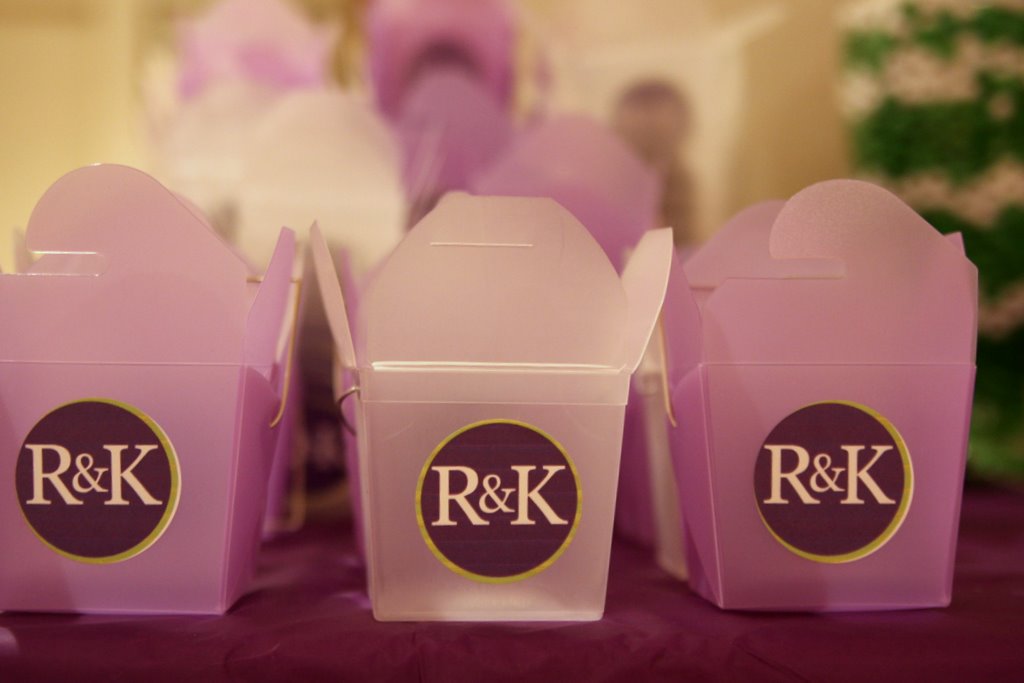 After all of that fun, we continued the night with some awesome line dancing! I had the best time and some of our guests got a sneak peek into the line dances that will be played at our wedding. Before the guests left there was a “Well Wishes” bird-cage, where they would leave words of wisdom or happy thoughts for us. Also, there was a candy bar for guests to fill small Chinese-takeout boxes to take home as their favor. The candy bar consisted of purple Mike & Ikes, purple yam (Ube) gummies, green watermelon jelly beans, green M&M’s, green apple gummy rings, and white candy covered chocolates. The candy bar was displayed in elegant apothecary jars and the Chinese boxes stacked next to it with little “R & K” logo stickers on them.