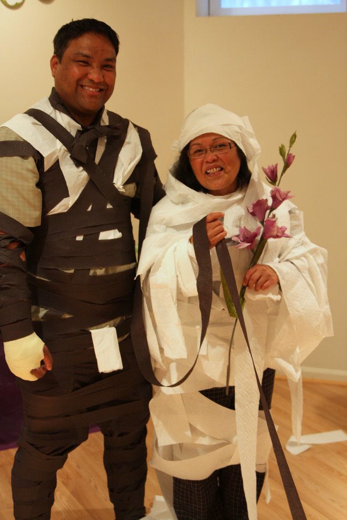 The next game the bridesmaids planned was the toilet paper bride game … with a twist! Since it was a co-ed wedding shower, the men were included in the game as well. The guests were divided into groups with each group getting black crepe paper and white toilet paper. Their job was to pick two people in the group, a “bride” and a “groom”, who were to be outfitted with a gown and a tuxedo made entirely from the materials. It was hilarious seeing everyone trying to create their best paper outfits. The results were fantastic given the constraints but I don’t think we will be contracting anyone to be our outfit designers for the wedding day! Here is the winning couple …