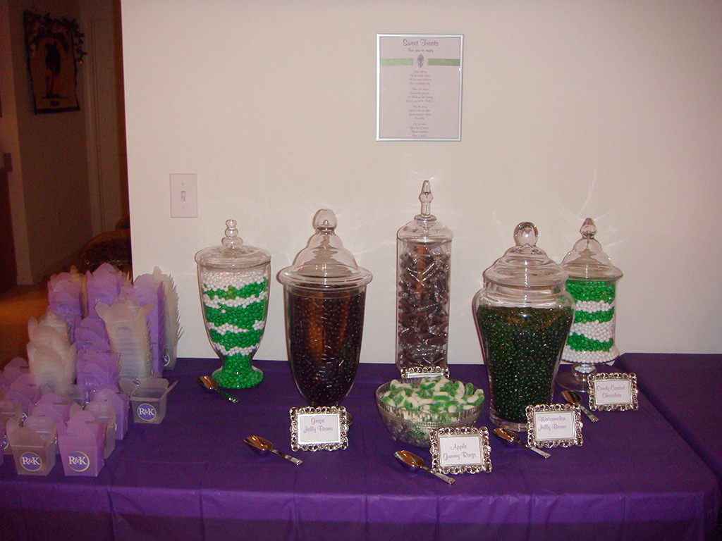 After all of that fun, we continued the night with some awesome line dancing! I had the best time and some of our guests got a sneak peek into the line dances that will be played at our wedding. Before the guests left there was a “Well Wishes” bird-cage, where they would leave words of wisdom or happy thoughts for us. Also, there was a candy bar for guests to fill small Chinese-takeout boxes to take home as their favor. The candy bar consisted of purple Mike & Ikes, purple yam (Ube) gummies, green watermelon jelly beans, green M&M’s, green apple gummy rings, and white candy covered chocolates. The candy bar was displayed in elegant apothecary jars and the Chinese boxes stacked next to it with little “R & K” logo stickers on them.